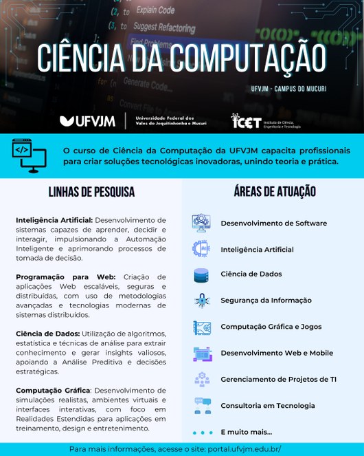 A graduação contempla áreas como Inteligência Artificial, Ciência de Dados, Desenvolvimento de Software, Segurança da Informação e Computação Gráfica, atendendo às demandas atuais do mercado e da pesquisa científica.